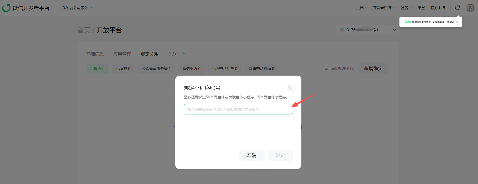 5、输入 小程序账号邮箱 或 小程序APPID 绑定: