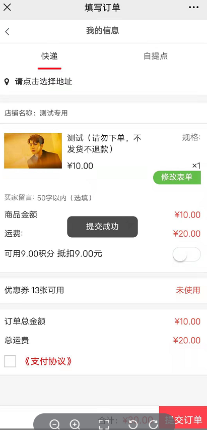 会员前端购买该商品需要填写好表单信息提交成功之后,才能提交订单购买商品