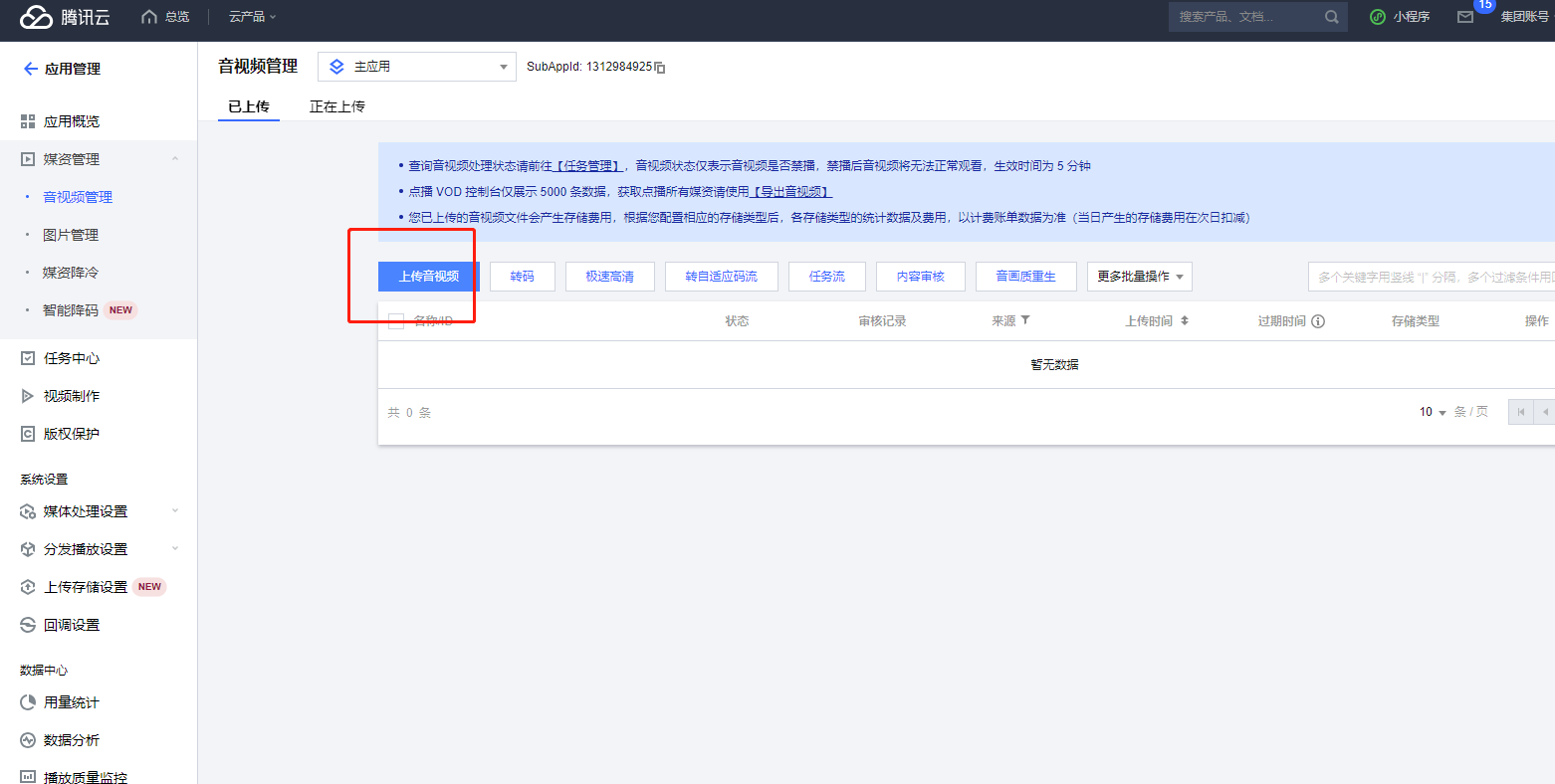 登陆腾讯云账号-搜索云点播-视频管理-上传音视频