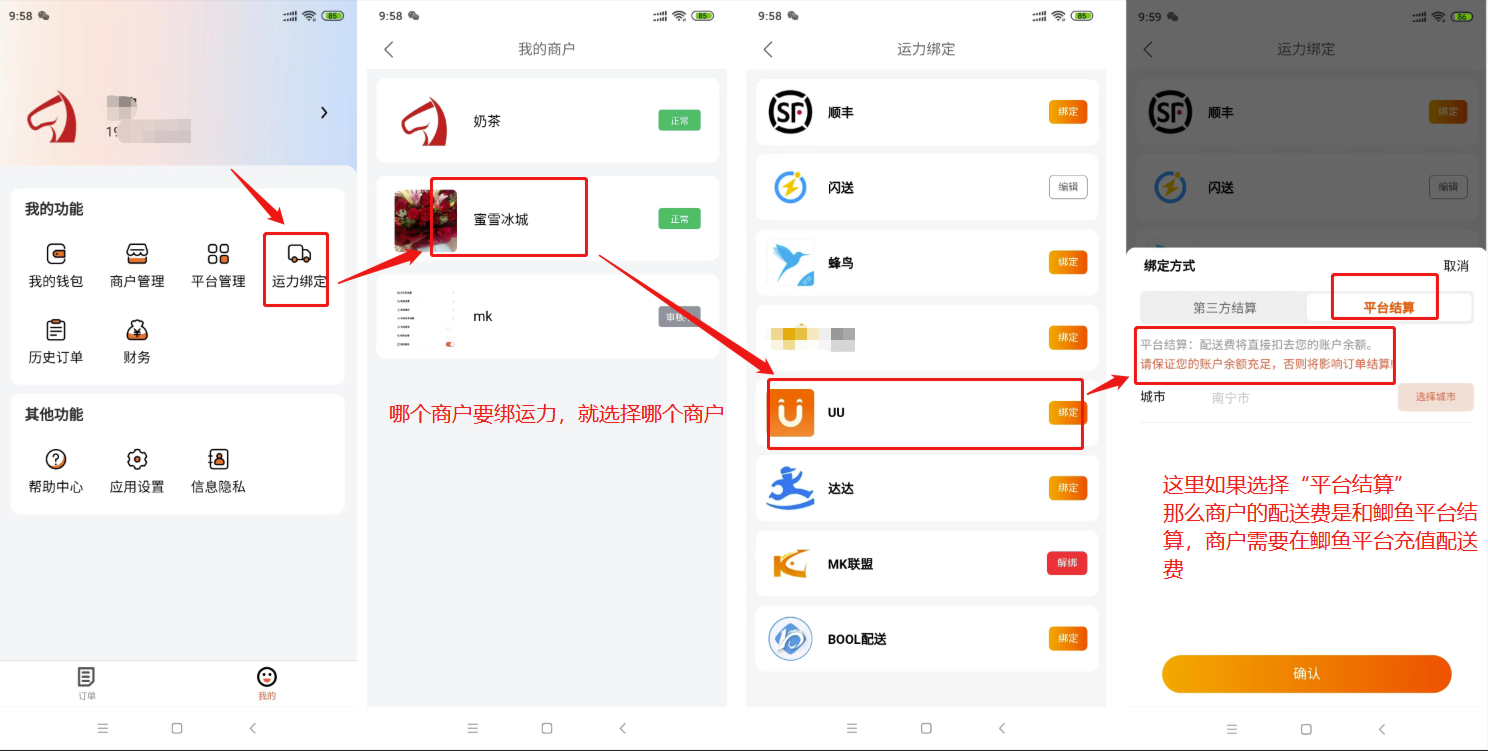 如果选择“平台结算”那么商户的配送费是和鲫鱼平台结算,商户需要在鲫鱼平台充值配送费。
