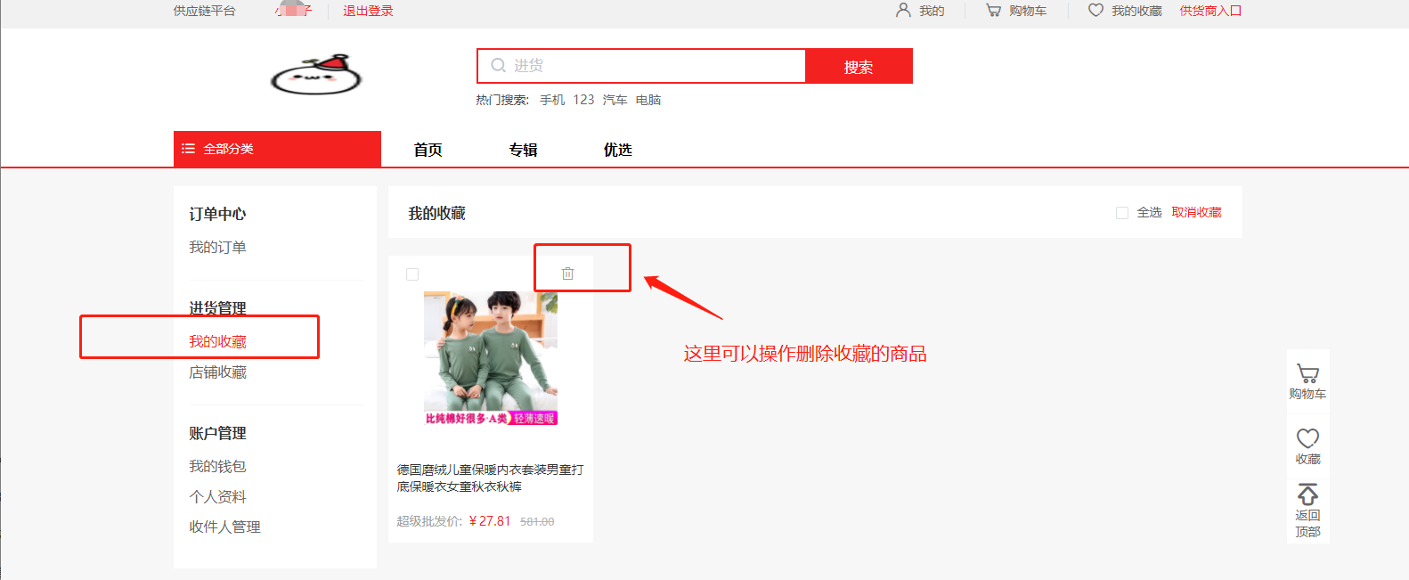 2) 可进行删除:每个商品右上角有一个删除,或者选择之后点击右上角的取消收藏。