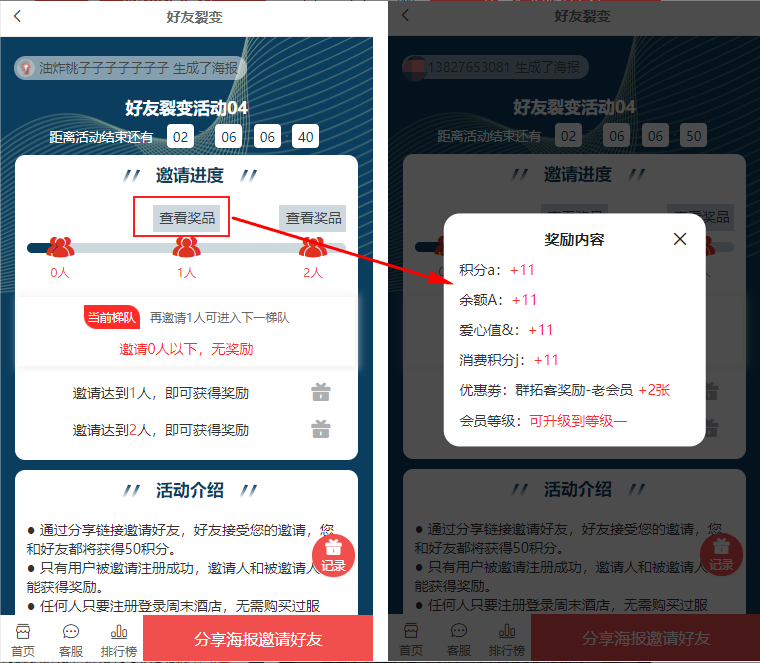 2、 好友裂变:以企业微信成员为载体,进行引流裂变;通过设置奖励积分、爱心值、余额、优惠券(兑换奖品)、会员等级(升级观看免费课程/享受折扣等)等吸引用户,让客户扫码添加企业微信成员为好友、获取专属海报,再邀请若干好友添加企业微信成员,完成邀请后即可获得奖励。