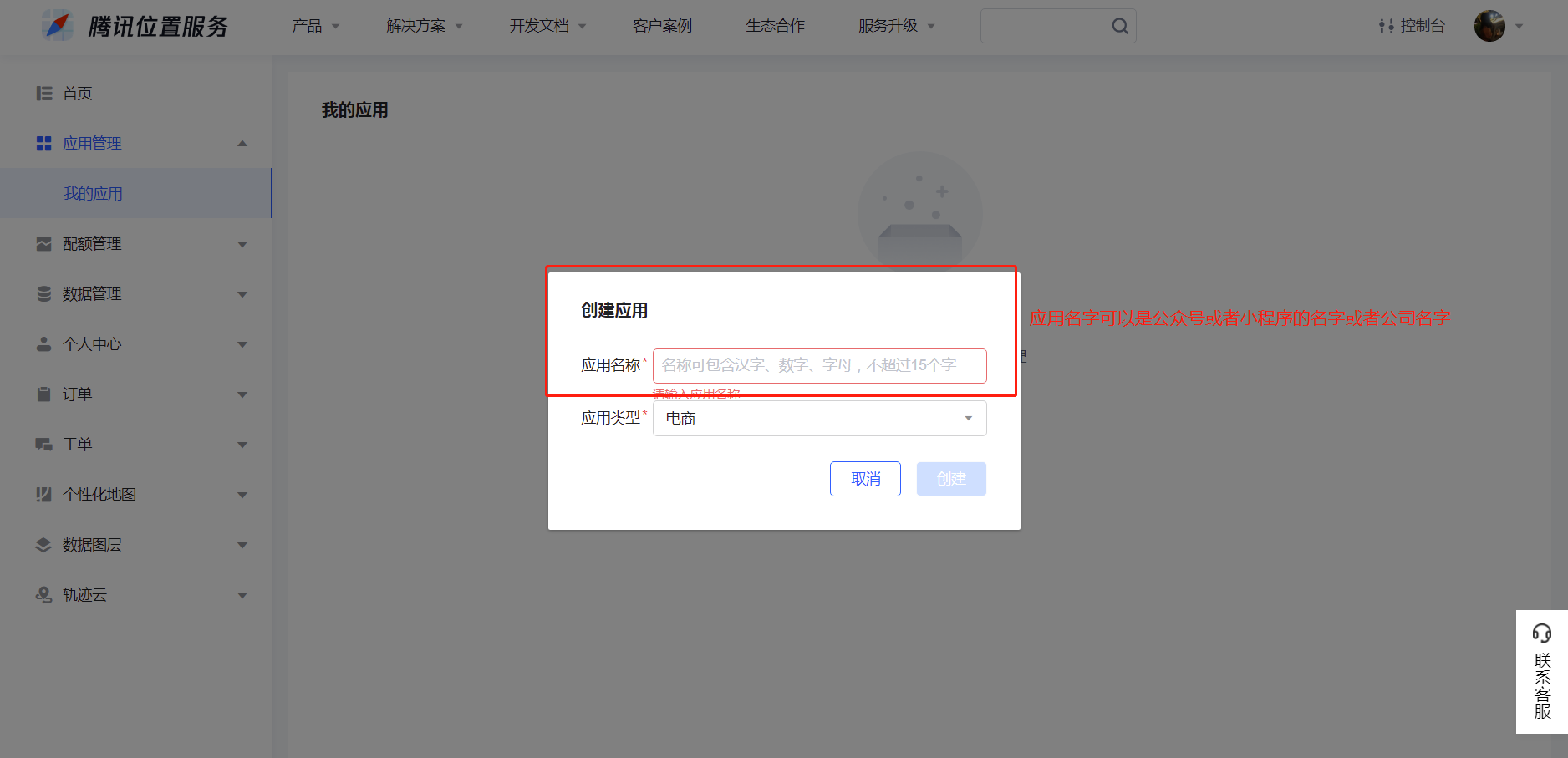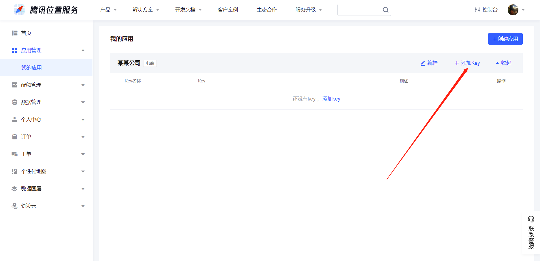 ⑤点击应用管理,我的应用,创建应用(添加key)