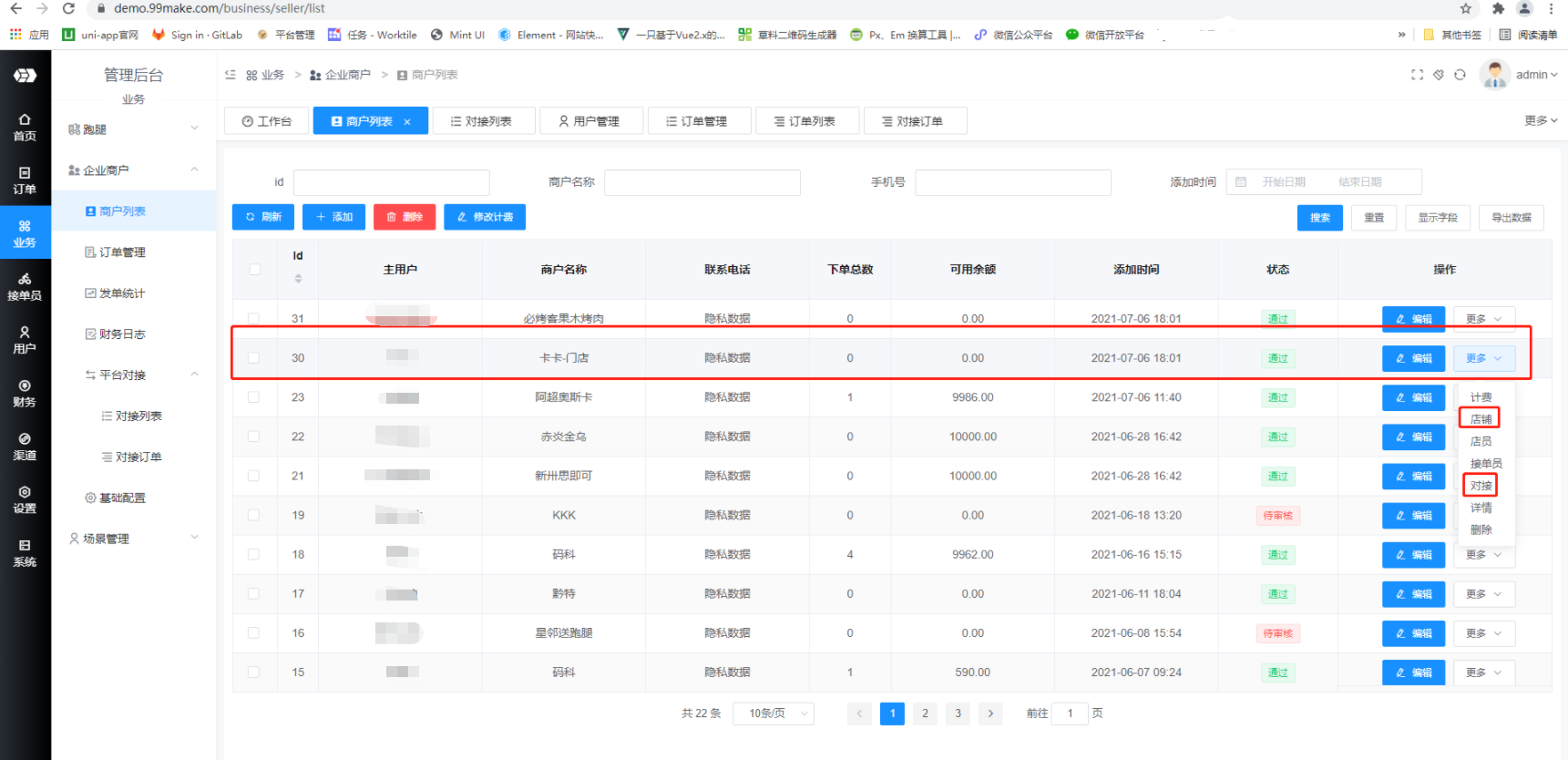 b. 第二种,需要用户在跑腿后台-企业商户-商户列表-添加中添加商户后,在列表中找到对应商户,点击更多-店铺,创建一个店铺并且设置相关信息,之后取企业商户-商户列表中的id,在跑腿配送插件-门店管理-绑定商户-绑定已有跑腿配送系统商户中输入id,执行绑定,如果绑定的跑腿商户之前已经绑定过对接关系了,执行该方法会报错,需要在跑腿后台跑腿后台-企业商户-商户列表-对接中删除对应绑定后再执行。