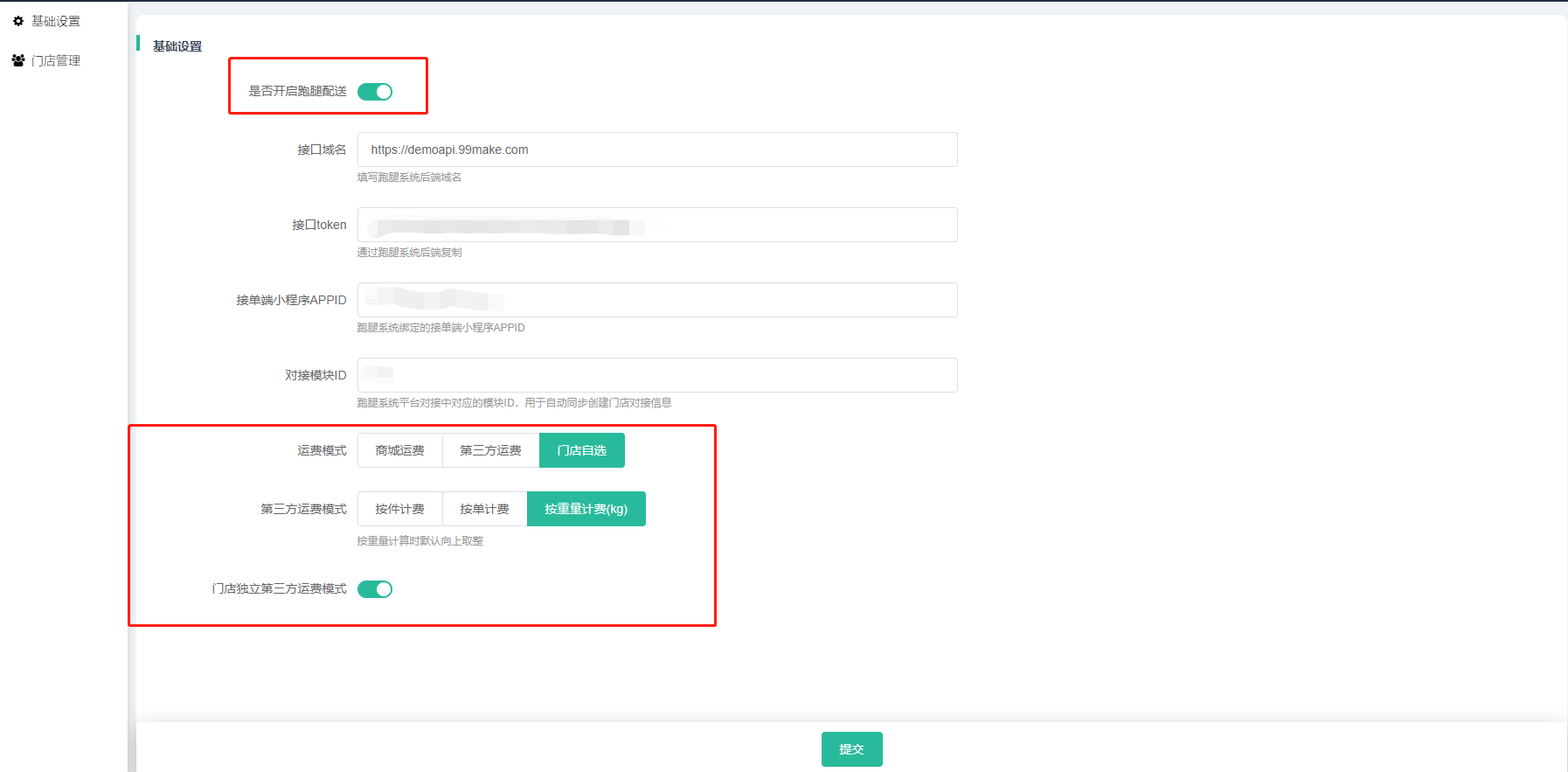②设置运费模式,如果设置商城运费或第三方运费,则所有门店都强制走对应的运费,如果设置门店自选,则在门店独立后台自行设置。第三方运费根据跑腿后台设置的运费,再乘以对应的数量(单数、商品件数、商品重量kg向上取整)。