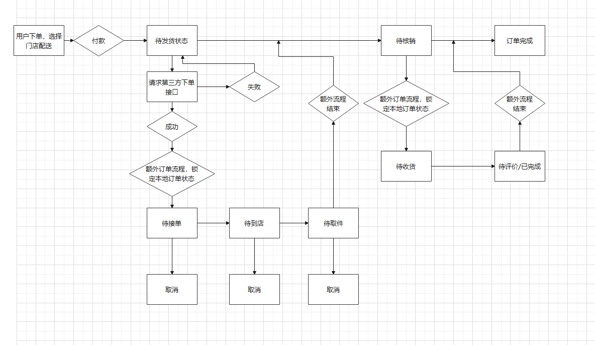 5.订单流程状态依次为:待支付-待接单-待到店-待取货-待收货-已送达,订单取消(主动取消跑腿订单),订单关闭(退款或者关闭商城订单),跑腿订单只有在骑手取货前可以取消。