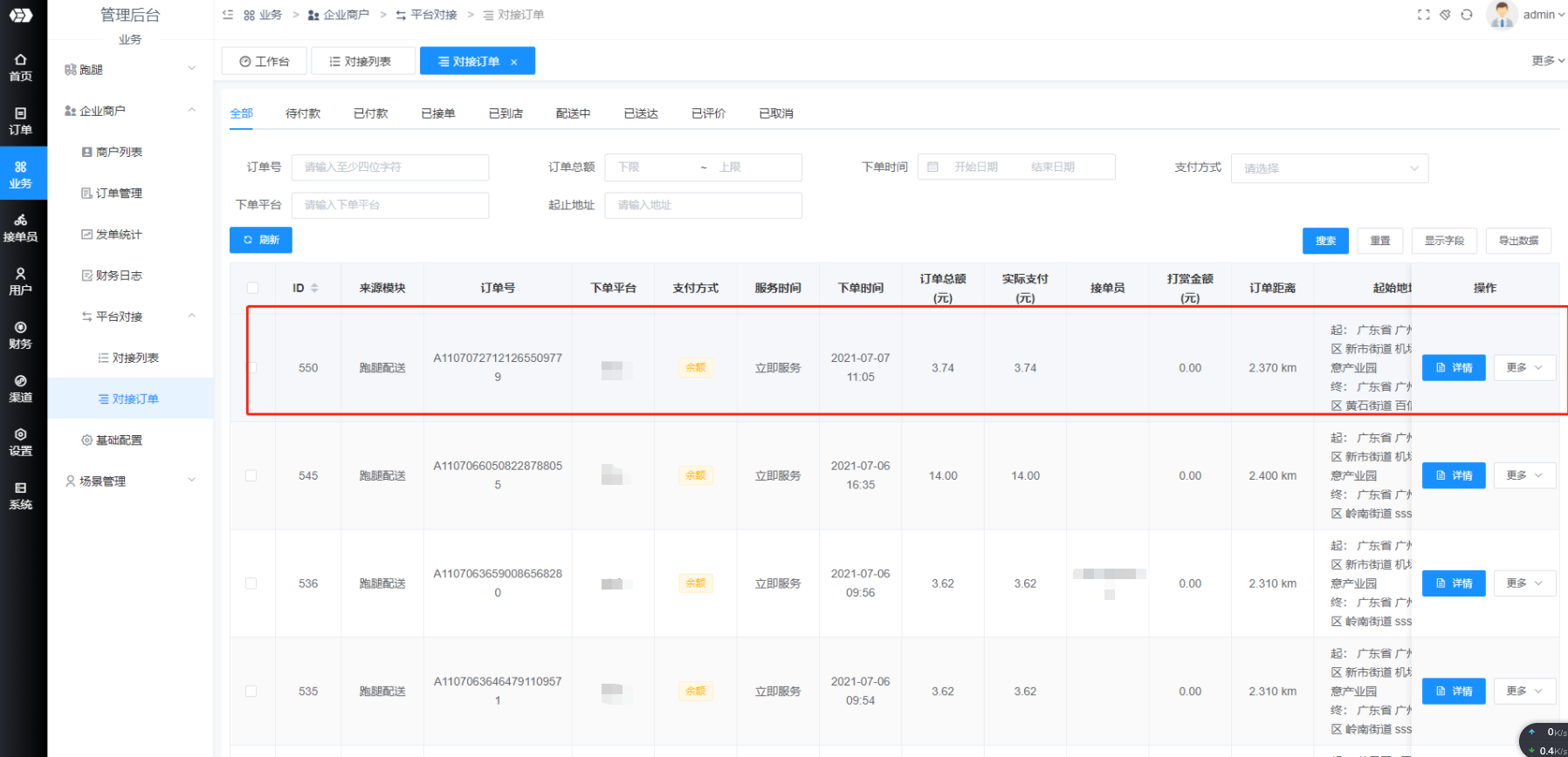 3.订单支付后在跑腿后台也会有相应的订单显示,并且会自动从对应的商户余额扣除运费。