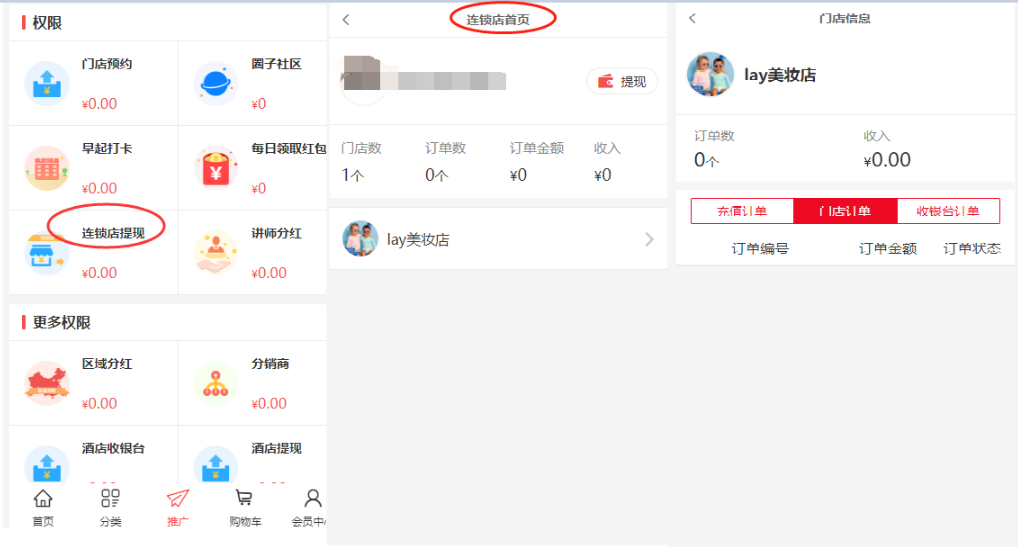 连锁店老板会在推广中心页面—连锁店提现-进入连锁店页面--可以看到自己管理多少个门店/连锁店提成分红金额
