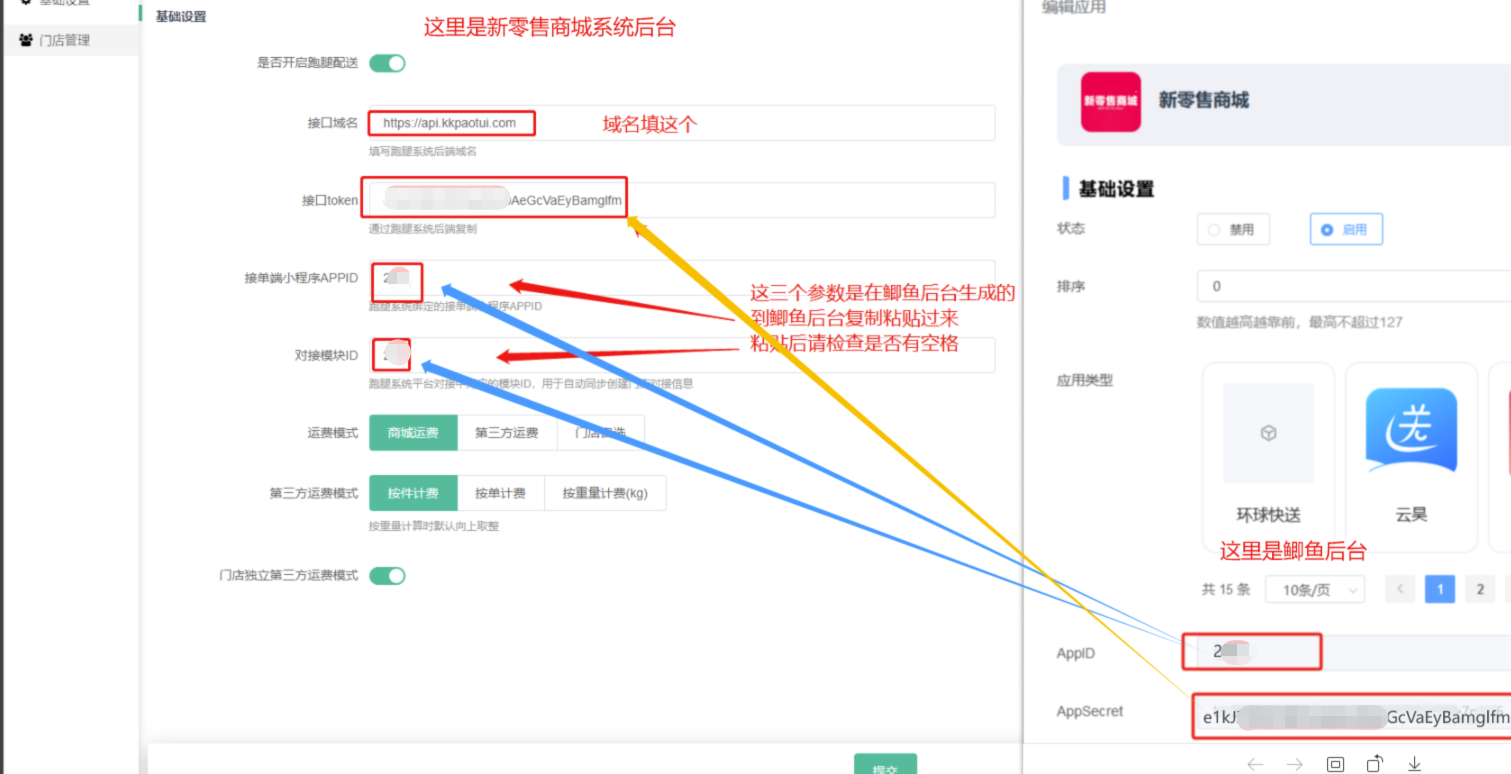 将上面第二步中提到的两个参数配置到商城系统-应用-跑腿配送插件中。