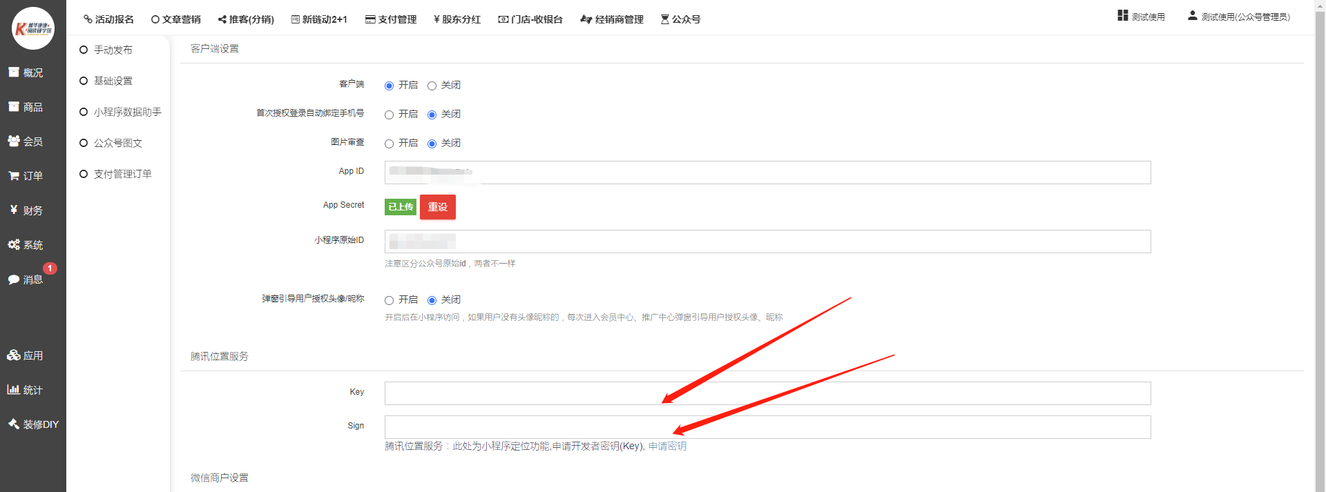 ⑩将获取的key和sign的数据复制粘贴到商城后台的 小程序key和sign里,最后保存。